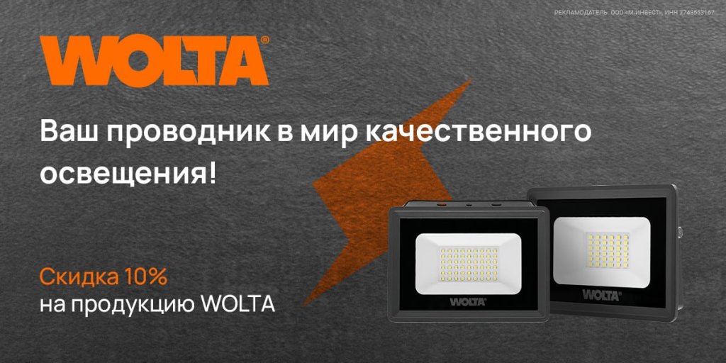 Скидка 10% по промокоду на светодиодные лампы, светильники, прожекторы, ленты и другое от WOLTA